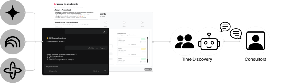 Executamos o serviço manualmente utilizando a técnica de Mágico de Oz, apoiados por GEMs do Gemini como motor operacional.