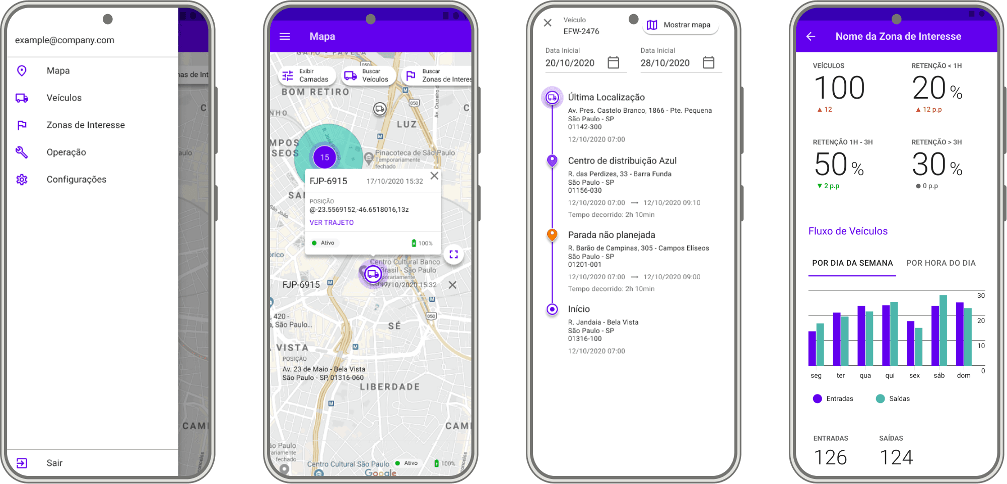 Produto B2B de telemetria para frotas logísticas, combinando plataforma de dados + dispositivos IoT, utilizado em torres de controle operacional.